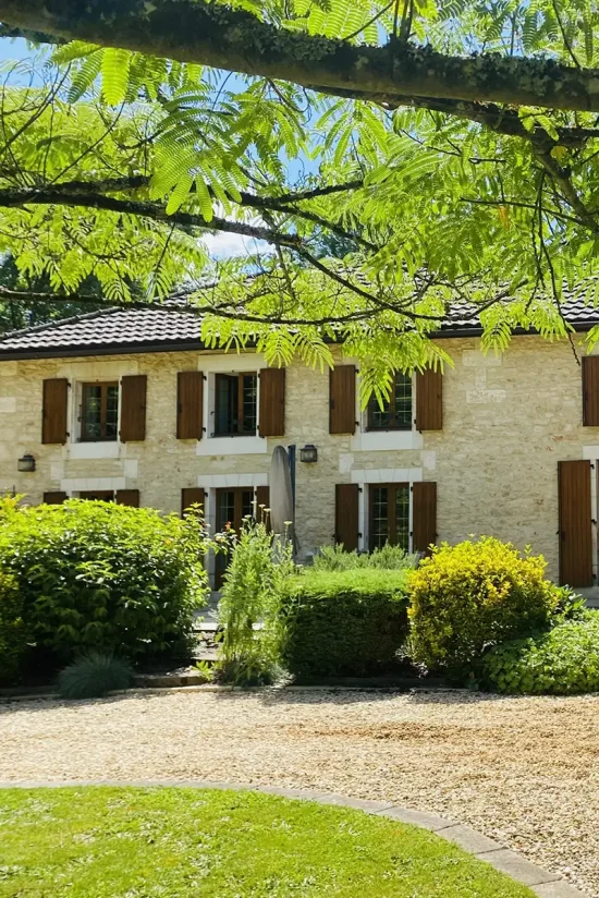 Our accommodations are as captivating as the surroundings. The house, surrounded by water and lush gardens, features beautiful Charente stone walls and oak flooring that set a charming and relaxing scene. Whether you’re looking to recharge your batteries, enjoy a romantic getaway, or find a peaceful space to work, Moulin du Fontcourt provides the perfect setting.