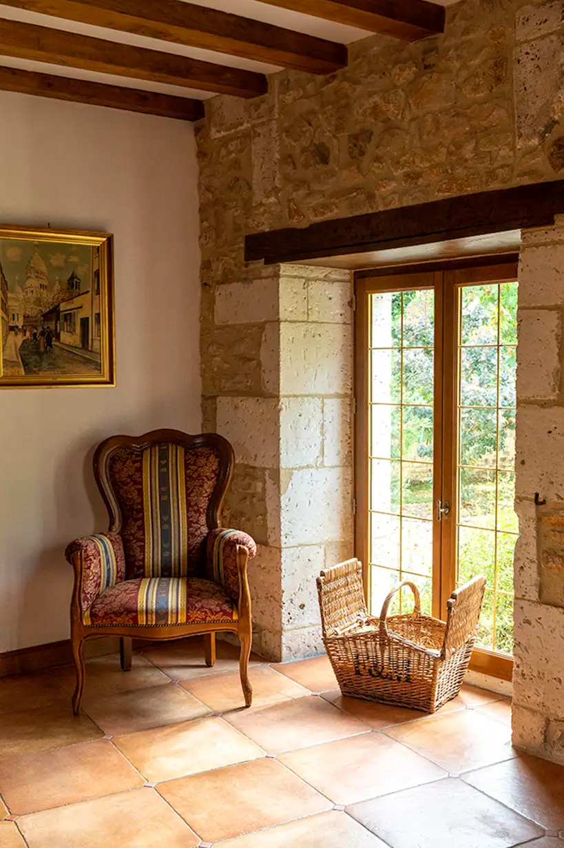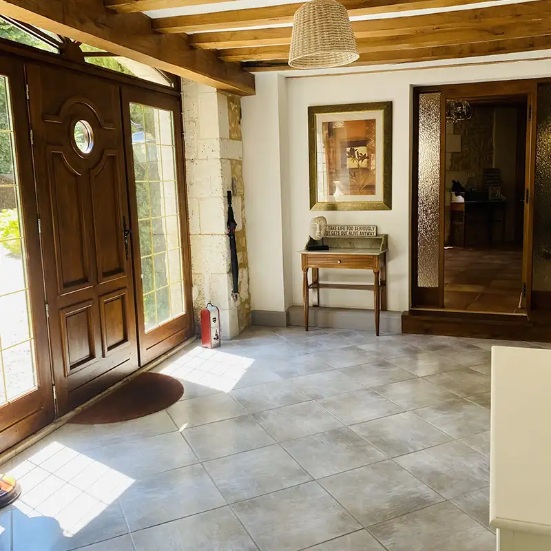 The Riverside Gite at Moulin du Fontcourt offers a luxurious retreat with its own private entrance that leads into a beautiful, spacious hallway bathed in natural light.